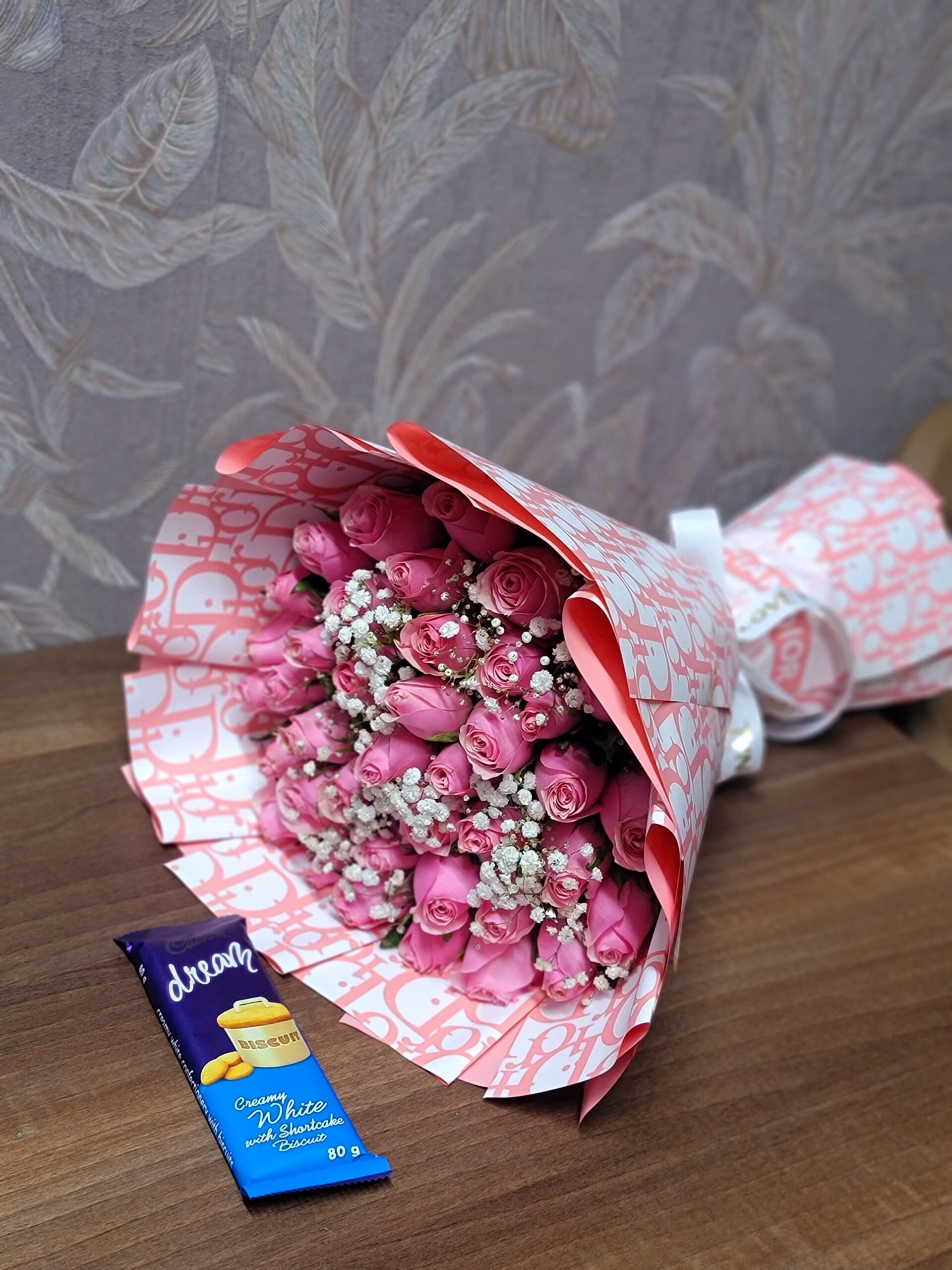 Express your love and appreciation with this stunning bouquet of fresh pink roses, elegantly arranged with delicate baby’s breath and wrapped in stylish designer paper. This charming floral arrangement exudes elegance and romance, making it a perfect gift for anniversaries, birthdays, or special surprises.