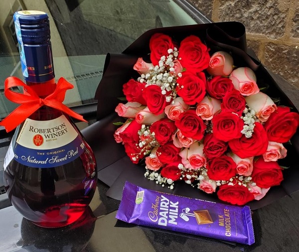 A beautiful bouquet of roses, robertson wine 750ml and cadbury chocolate