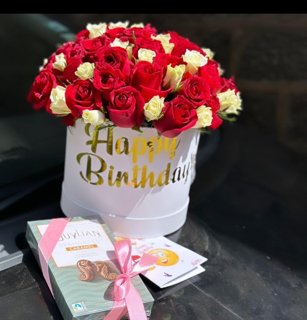A luxurious arrangement of fresh red and white roses, beautifully presented in a round box, paired with a box of premium Guylian chocolates. The perfect romantic gift for Valentine’s Day, anniversaries, birthdays, or special surprises.