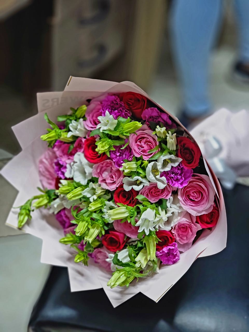 This bouquet is a vibrant and lush arrangement featuring a stunning mix of fresh blooms in various shades of pink, red, white, and green. It includes: