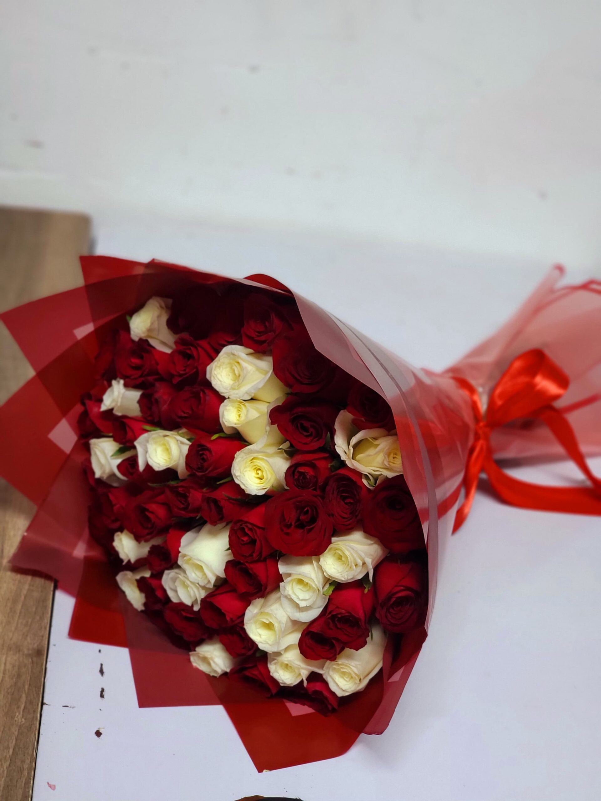 Elevate any occasion with this stunning arrangement of premium red and white roses, elegantly wrapped to impress. The passionate red roses symbolize deep love and affection, while the serene white roses bring a touch of purity and grace. Perfect for anniversaries, birthdays, romantic gestures, or just because.