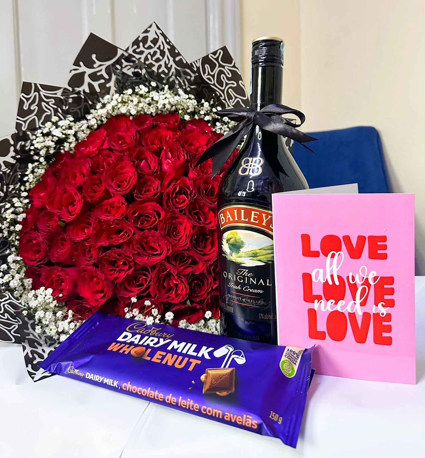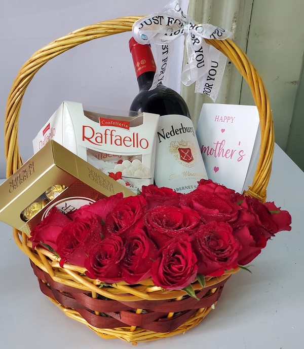 Indulge your loved one with the perfect blend of elegance and affection. Romance in a Basket features vibrant fresh red roses, a bottle of Nederburg Cabernet Sauvignon, premium Ferrero Rocher and Raffaello chocolates — all nestled beautifully in a charming wicker basket.