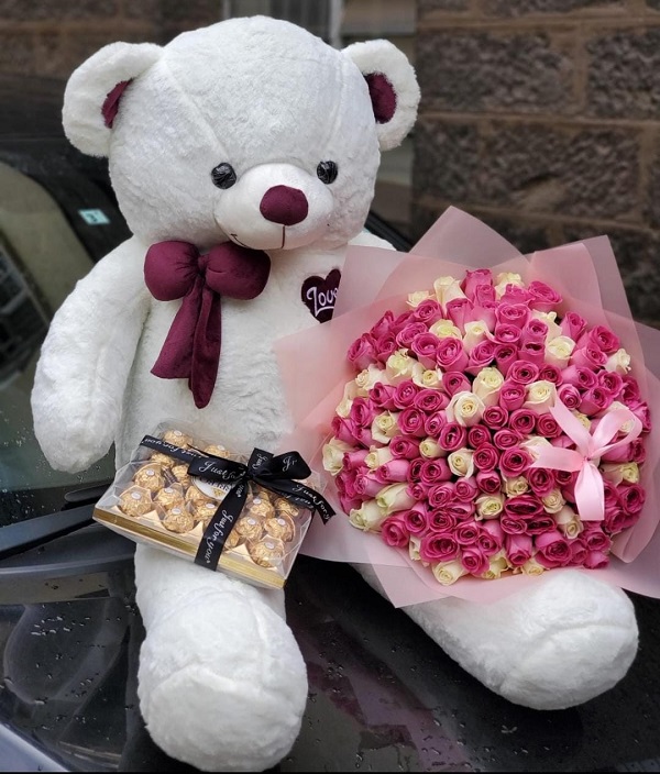 Brighten someone’s day with this 120cm teddy bear, bouquet of roses and ferrero rocher 24pcs a cuddly and heartwarming gift that’s perfect for any occasion. Its oversized design and soft texture make it a lovable companion for all ages.