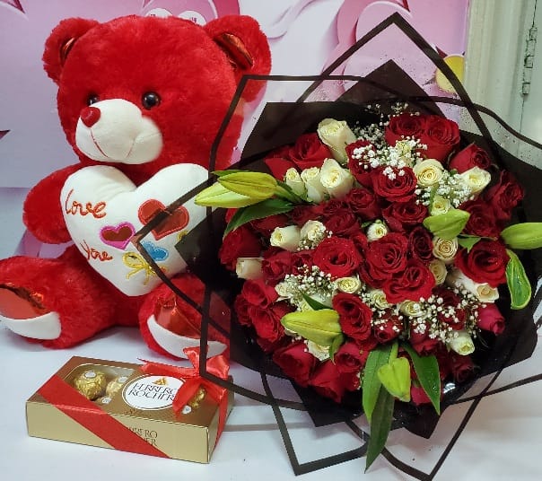 Brighten someone’s day with this 120cm teddy bear, bouquet of roses and ferrero rocher 24pcs a cuddly and heartwarming gift that’s perfect for any occasion. Its oversized design and soft texture make it a lovable companion for all ages.